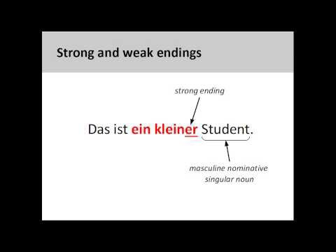 The bell is about to ring, ending this class. Let me end with a metaphor. A German noun looks to its left for a strong ending that signals a function. By seeing that strong ending it knows its function or at least it narrows the number of functions. The adjective to the right of the strong ending sees that strength and relaxes, knowing that it can now become weak (e or en). If that same adjective does not see strength it cannot relax: it has to take on the strength itself. No chance for weakness. If that noun sees an ein word to the left without an ending (ein, mein, dein, sein, unser, euer, etc.) it says to itself “An ein is certainly not an einem or an eines or an einen, so it looks like I am on my own, so the adjective to the right of ‘ein’ will just have to take on the strong ending.