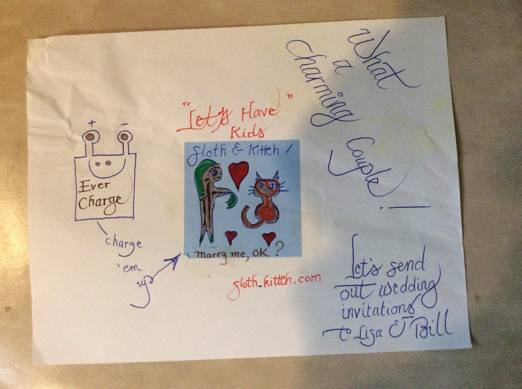 Where did these creatures evolve into separate recognizable forms. Here we have the beginnings of a wedding invitation. Sloth and Kitteh are getting ready to share a residence and to raise children that get to partake in a social contract on some distant planet. Why not?