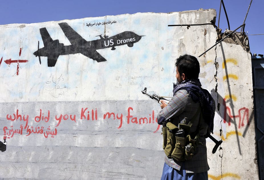 Freedom fighters who drop hell from a blue sky, making the world safe for the hegemonic. A blue sky is chosen because it makes the tracking of innocents more visible. The joystick may be in an F16 or some such death dispersal device. Or that joystick may be located in a bunker somewhere in a red State. It is dark underground, where a soldier sits with headphones and observes the details revealed by the Sun. It also makes it possible to read the fear on the faces assigned to death. I understand that the cameras available on a drone are capable of allowing the death dealer to look into the eyes of the target marked for death. PTSD is the most commonly reported response for the brain of the joystick holder. Freedom is not free — it requires the expenditure of many black and brown bodies.