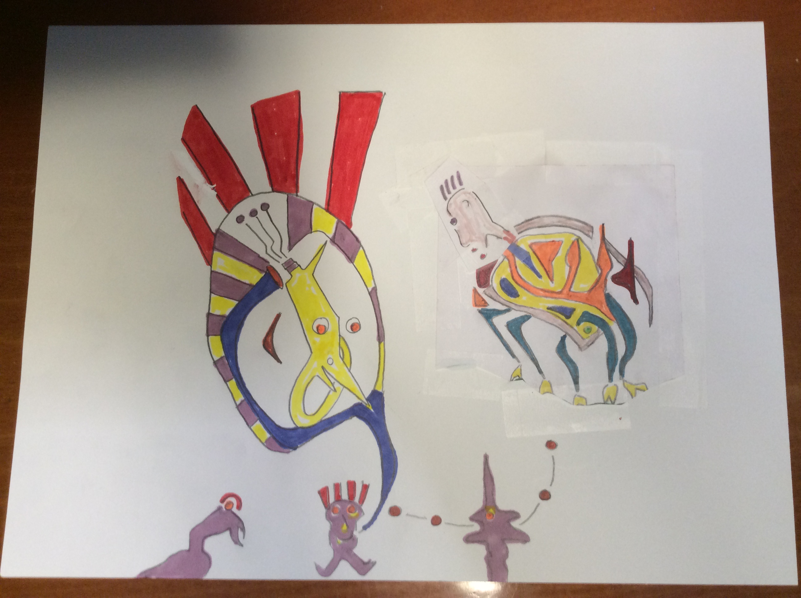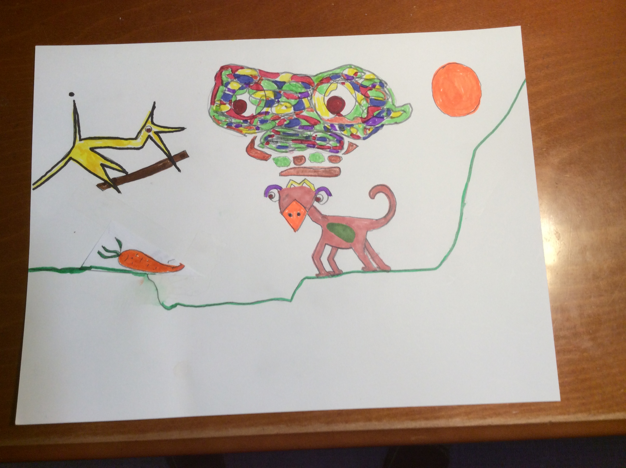 Here we have a stony-faced observer in the sky, next to a bright-orange sun, gazing upon the goings on below. The yellow fellow to the left holds the proverbial stick, the carrot (also orange, but also delicious) is a short distance from our hero. Let’s call him Sir Orange Beak, shall we?
